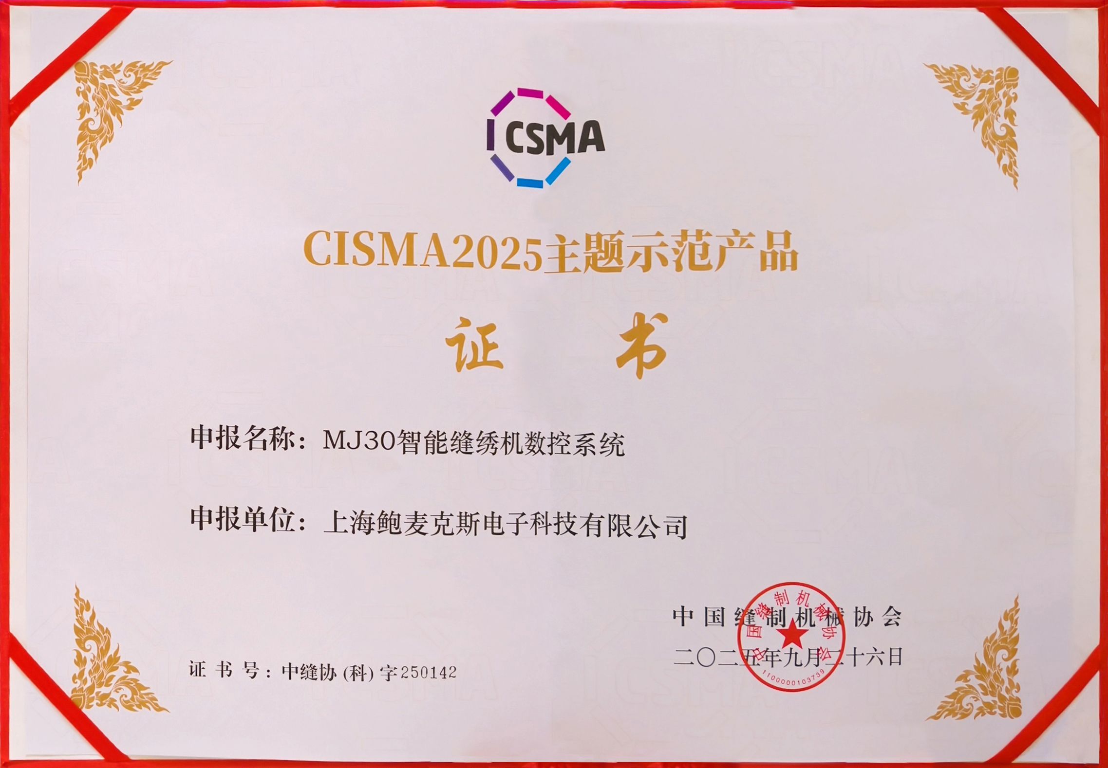 2025 MJ30智能缝绣机数控系统荣获“CISMA2025-主题示范产品”奖